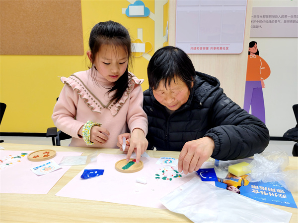 接着,社区居民在老师的指导下,化身手工达人,发挥自己的创造力和想象力,选择自己喜欢的五彩瓷片,在背面涂上胶水,按照各自喜欢的样式摆放在竹质杯垫底托上,共同体验拼花杯垫制作的乐趣。最后,大家高举自己亲手制作的拼花杯垫合影留念,喜笑颜开。现场洋溢着温馨和谐的浓厚氛围。